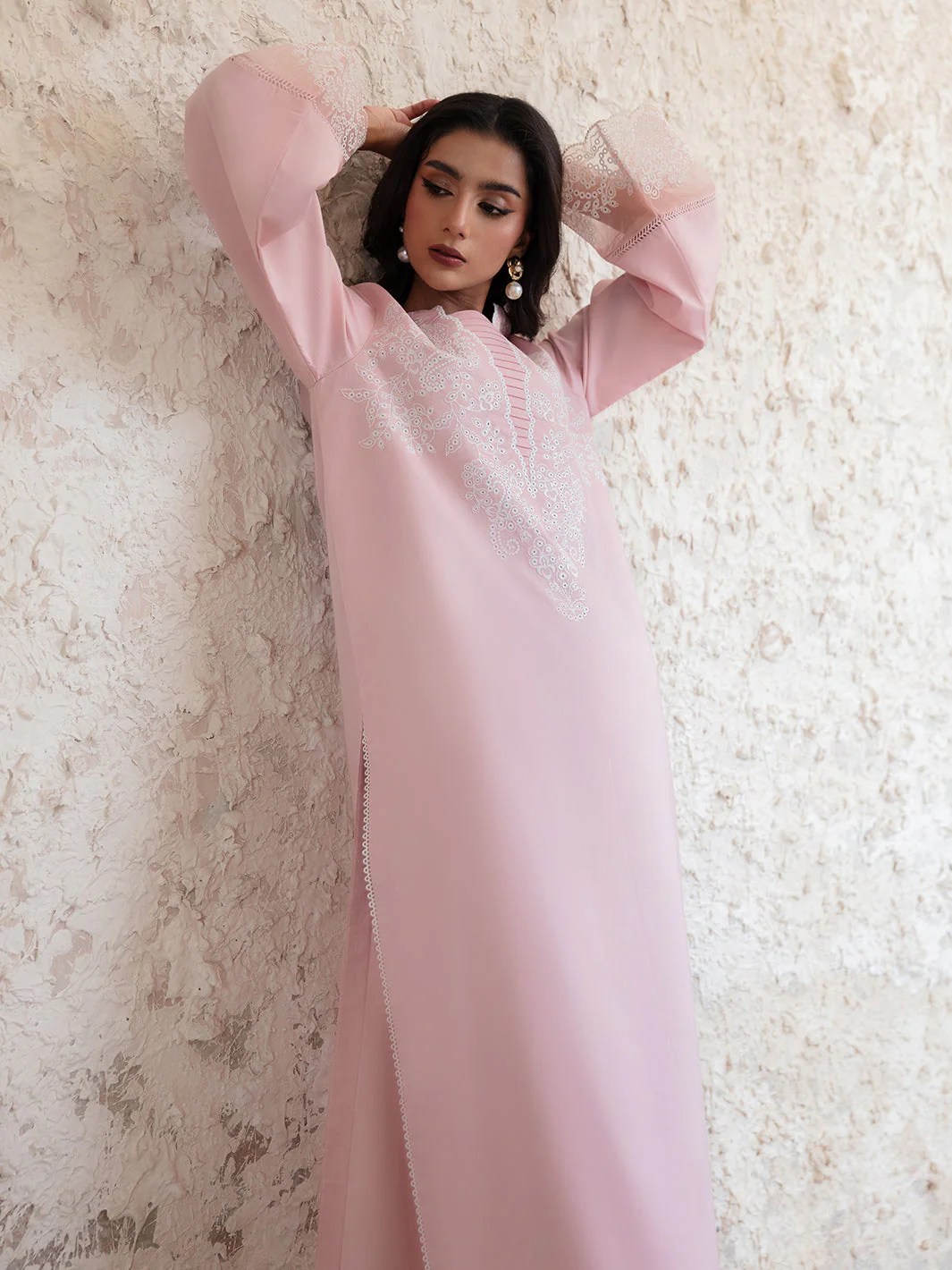 Soft, feminine, and effortlessly elegant – Ayla is a long-length powder pink kurta that embodies grace with its delicate Chikankari embroidery. The lace detailing on the side slits adds a touch of sophistication, making this outfit a beautiful blend of tradition and modernity. Crafted from a lightweight and breathable fabric, this kurta ensures all-day comfort while keeping you stylish.