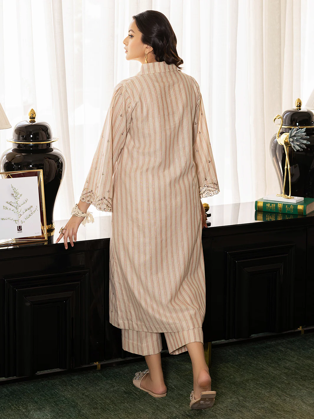 Step into elegance with our versatile skin-colored Coconut Dress. This two-piece ensemble is meticulously crafted from yarn-dyed, breathable cotton lurex weaved fabric, ensuring utmost comfort and breathability. The front of the dress boasts stunning embroidery, while the full sleeves feature intricate cutwork details. The Chinese ban button accents on the front slit bring a touch of uniqueness and style. With its A-line shirt silhouette and box pleats on the sleeves, the Coconut Dress offers a timeless and flattering look. Complete with chic chopped pants, this ensemble is the epitome of contemporary sophistication.