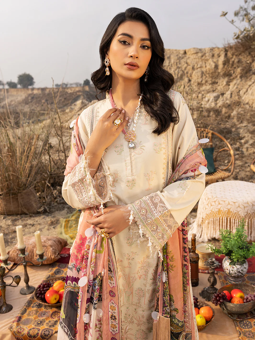 A buttermilk lawn luxury shirt features embroidered panels on the left, right, and center of the front, and an intricately embroidered back. The shirt is paired with a dyed trouser and a pink silk dupatta, featuring a beautiful digital print. This dress offers a perfect combination of elegance and style.