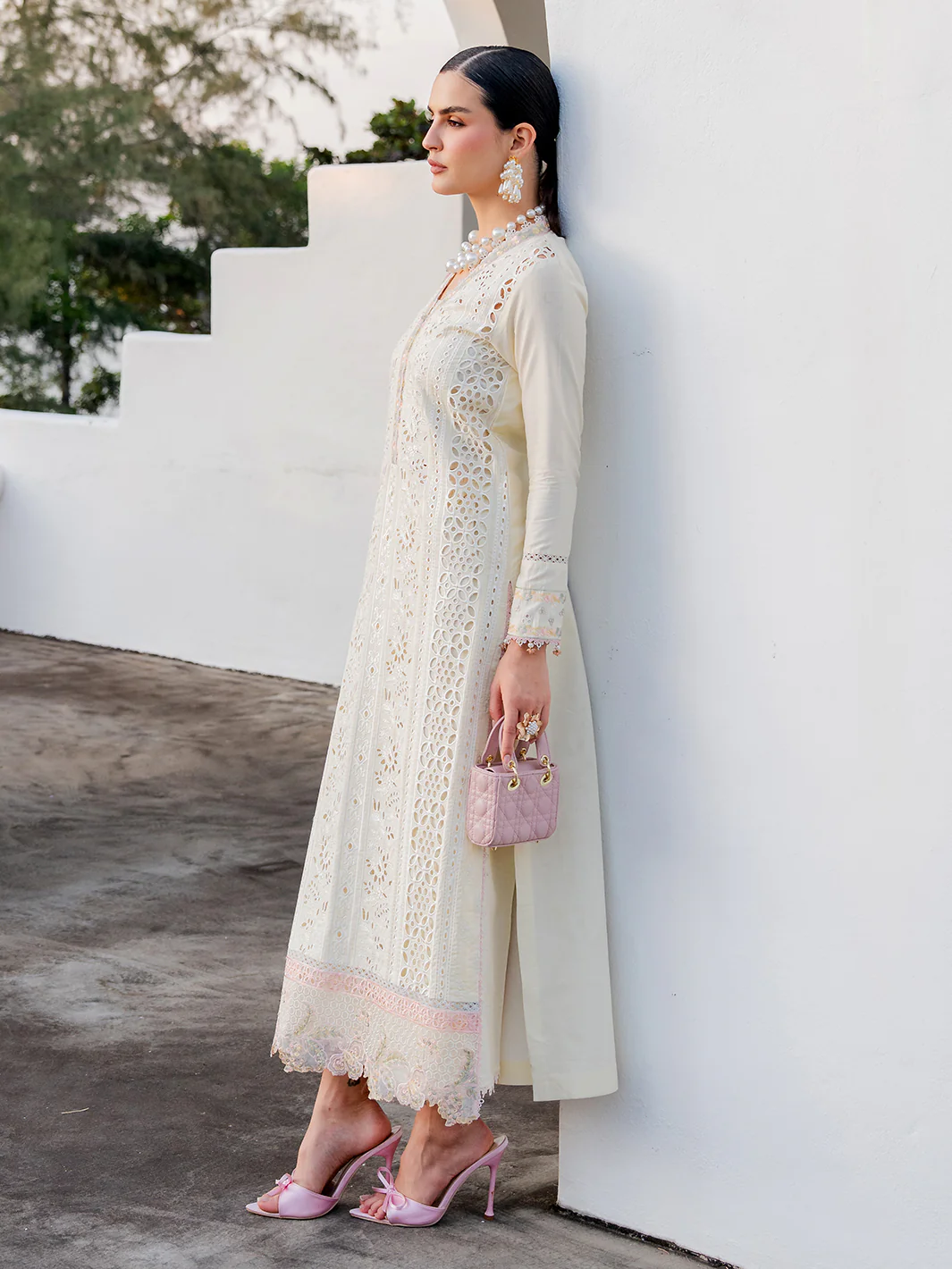 Step into elegance with Mehmal from the Dareen Luxury Lawn collection. Embroidered lawn organza detailing on the neckline and front border and a digitally printed silk dupatta create a look that is effortlessly refined completed with plain dyed cotton trousers for timeless sophistication.