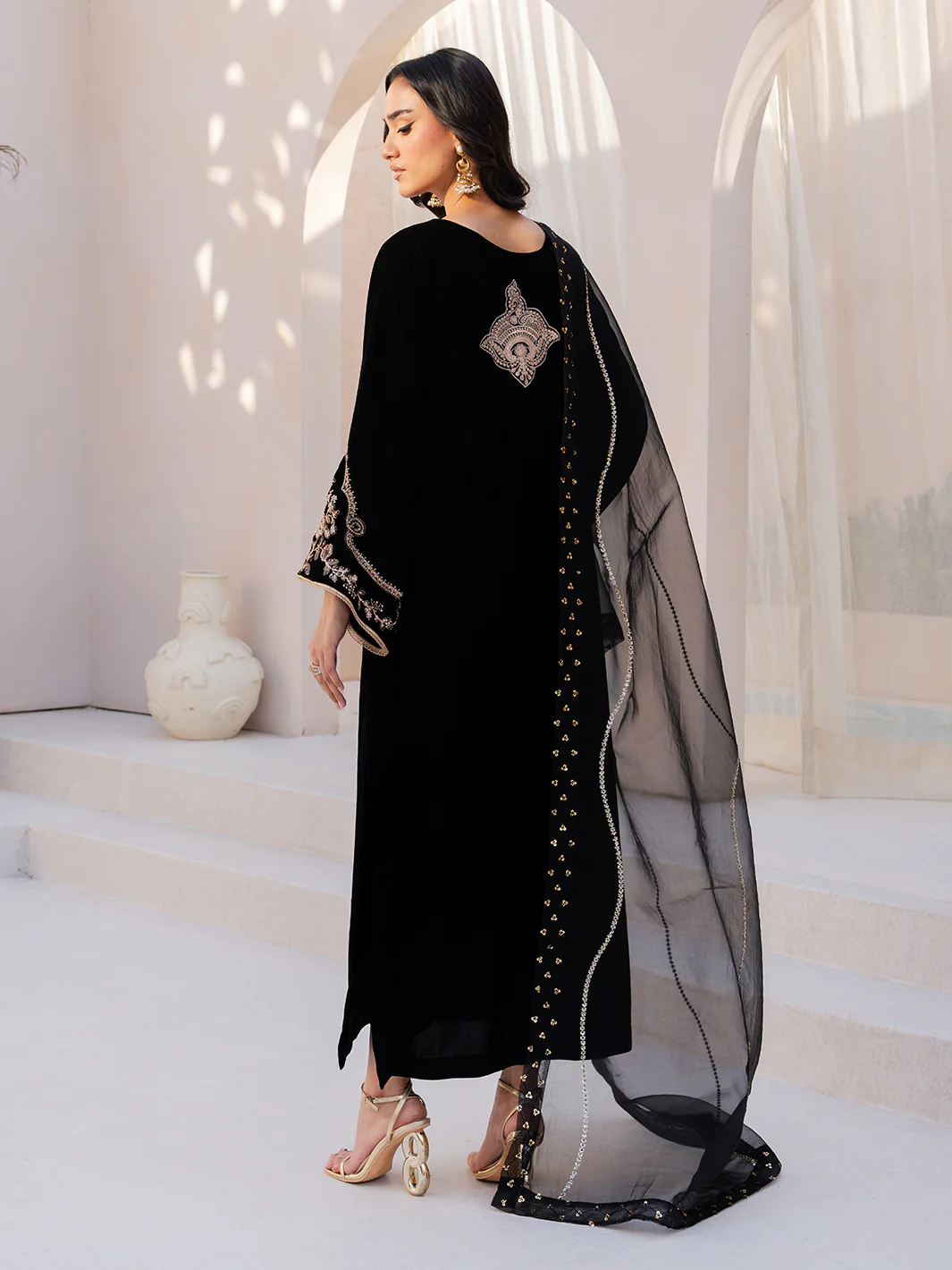 Orabel from the Le Tresor Collection is a celebration of refined elegance. Featuring an embroidered velvet front and sleeves with a delicate back patch paired with a plain velvet back and plain raw silk pants this ensemble strikes the perfect balance between intricate craftsmanship and understated sophistication. The embroidered organza dupatta adds a graceful finishing touch