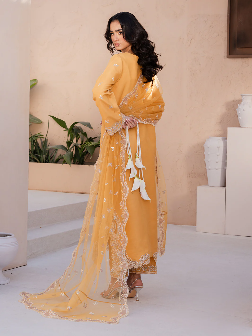 Oria from the Le Tresor Collection exudes effortless sophistication. This luxurious ensemble features an embroidered raw silk front and sleeves with a plain raw silk back complemented by embroidered organza patches on the front and back damn. Embroidered pants borders and plain raw silk pants add subtle elegance while the embroidered net dupatta with detailed pallu completes the look